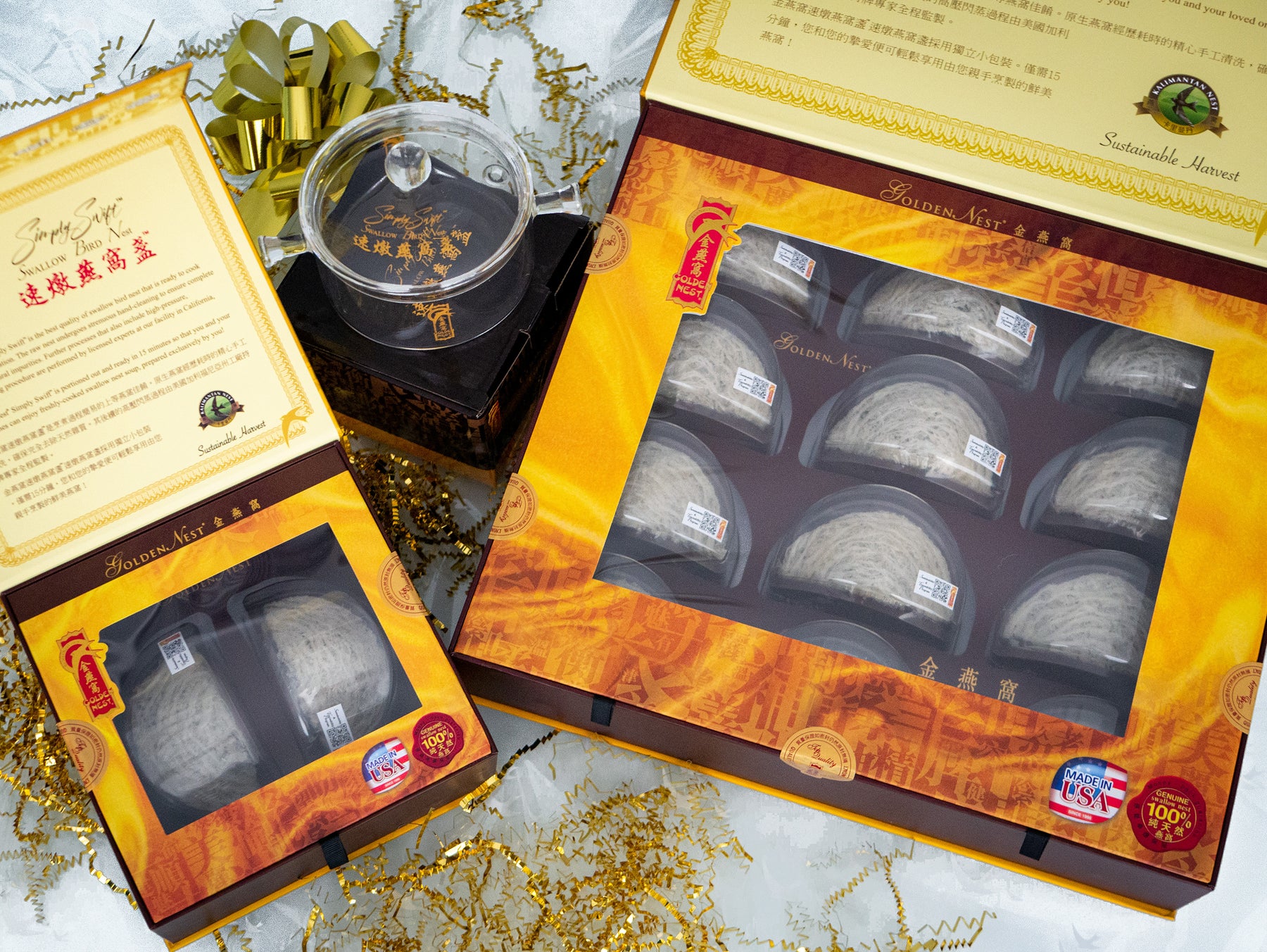 金燕窝 Simply Swift™速炖燕窝盏 金燕窝100% 纯天然金燕窝。这套包装精美的礼篮将Simply Swift™速炖燕窝盏 特色体验融入到方便快捷的烹饪方式中,在炉灶上只需 15 分钟即可享用。